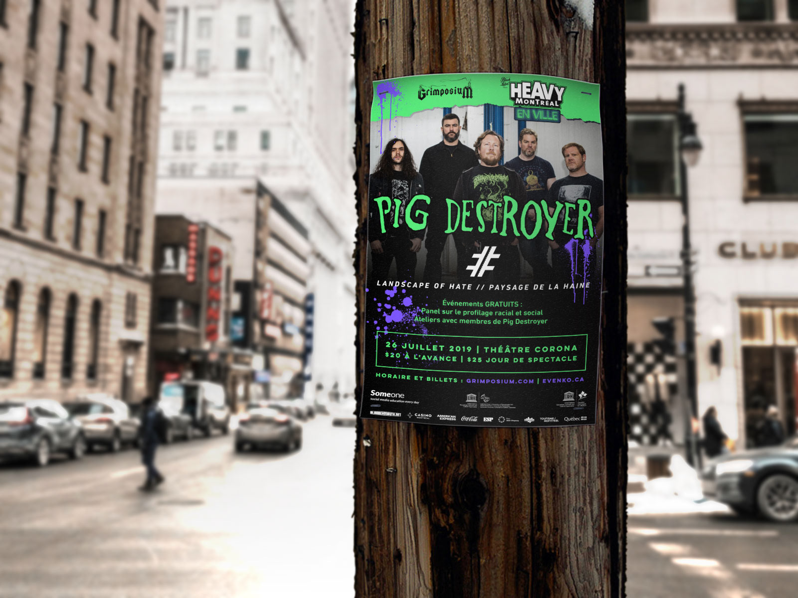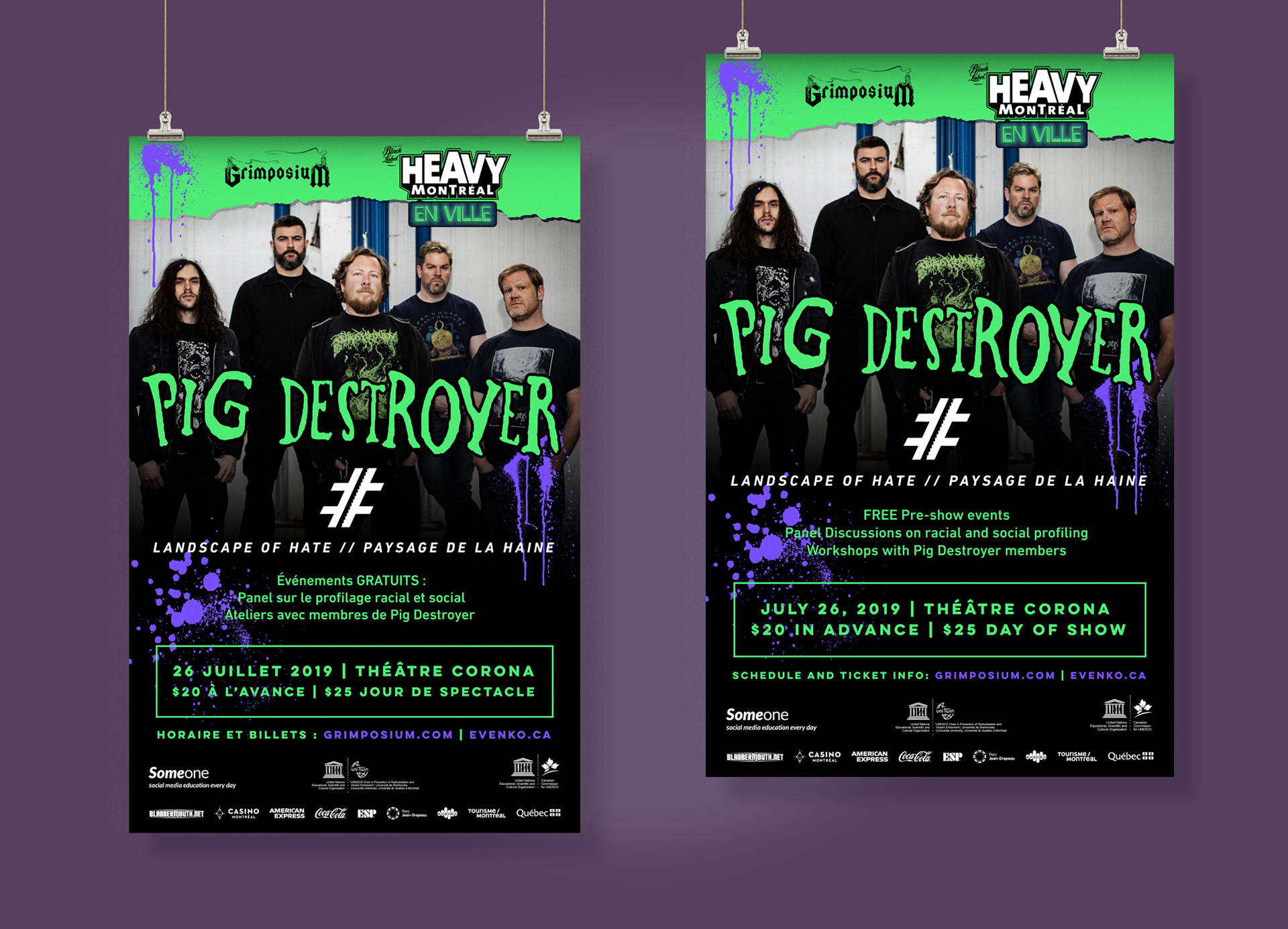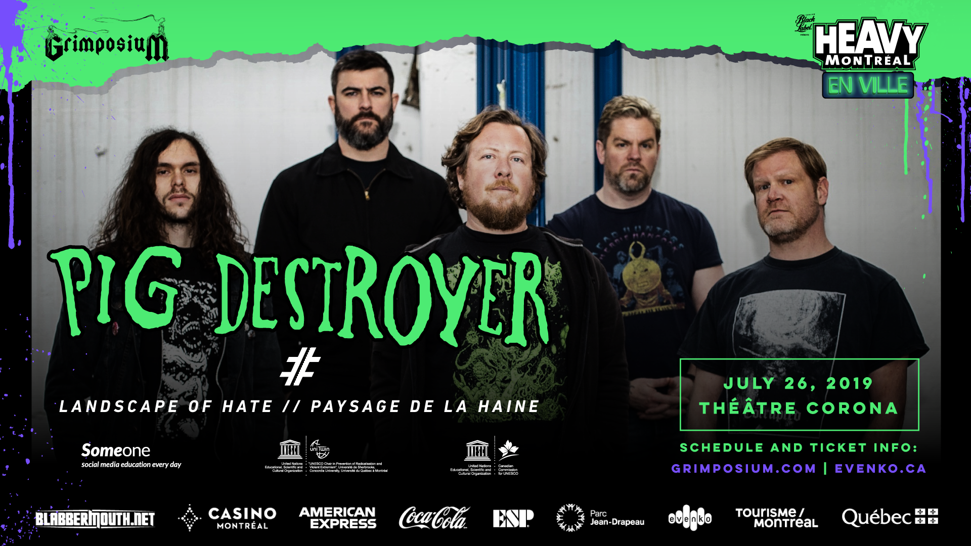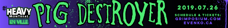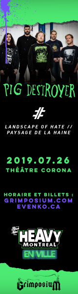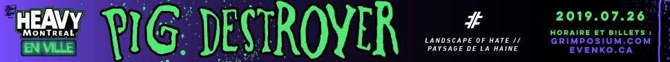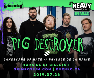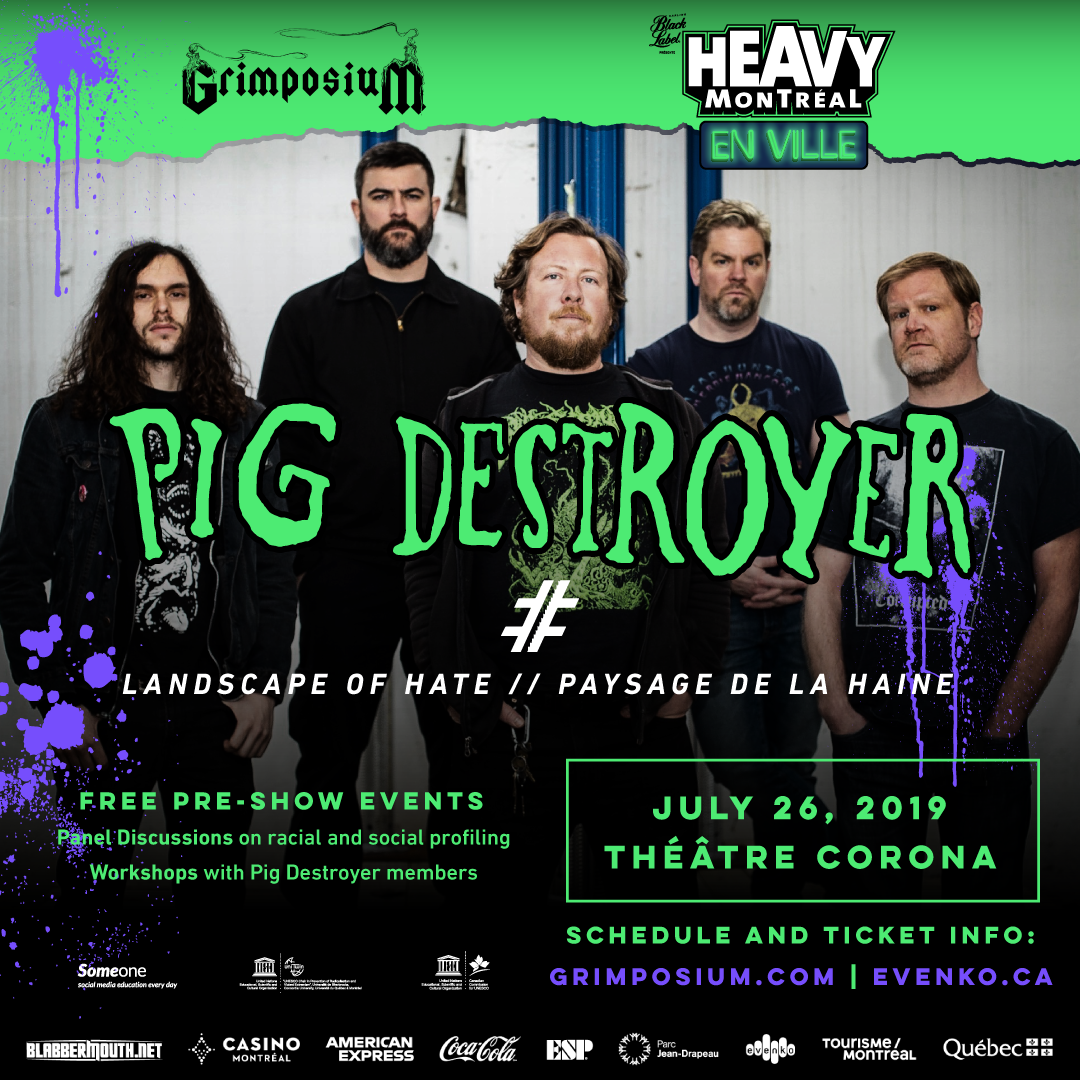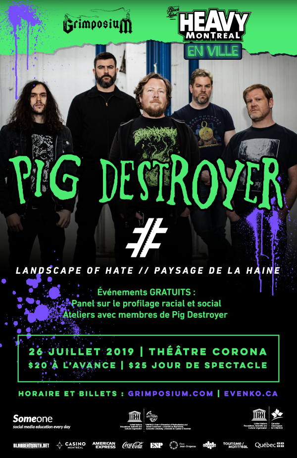 Event visuals for Pig Destroyer show and Landscape of Hate performance (2019), hosted by Grimposium and Heavy Montréal En Ville, in both French and English.